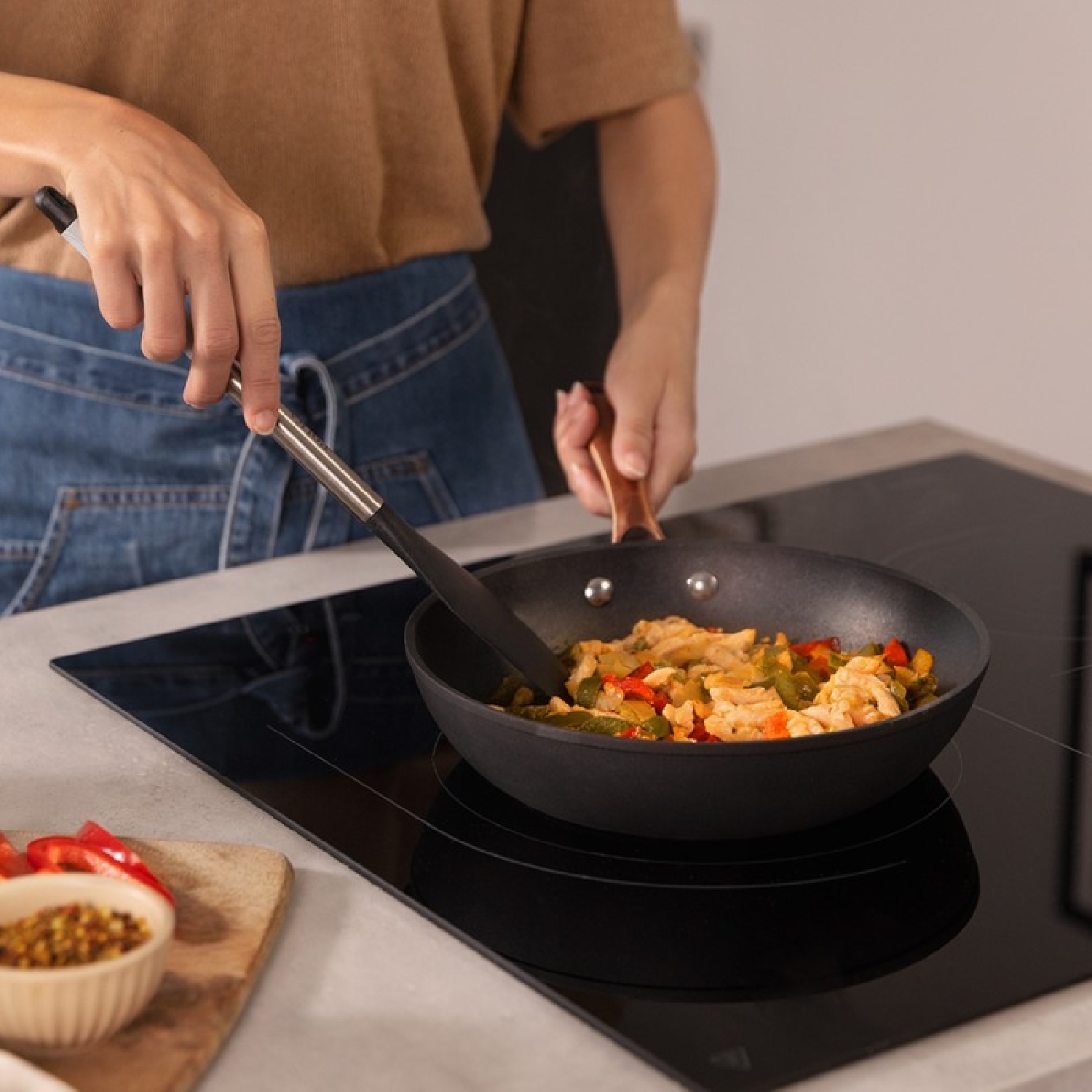Bratpfannenset 20-24-28 cm aus geschmiedetem Aluminium mit hochwertiger Antihaftbeschichtung Platinum Plus Teflon® Nonstick, 100 % PFOA-frei. Semiprofessioneller und genieteter Edelstahlgriff in Rosagold. Backofenfest bis 230ºC, spülmaschinenfest und für alle Herdarten geeignet, auch für Induktionsherde. Besteht aus 5 Schichten und 3,4 mm Induktionsbasis.
