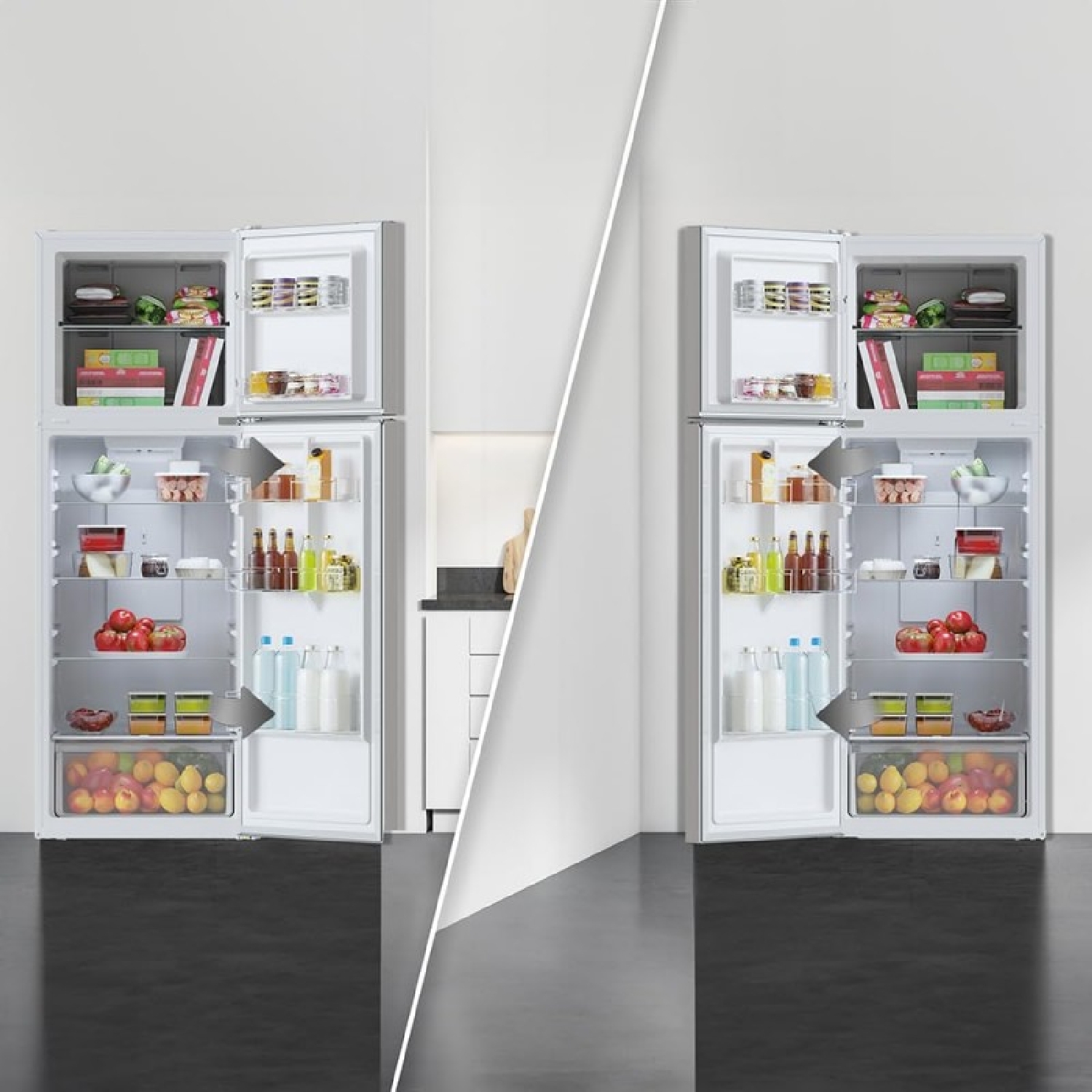 2-türiger weißer Kühlschrank mit einer Höhe von 170 cm und einer Breite von 59,5 cm mit einem großen Fassungsvermögen von 348 Litern und Inverter-Motor mit 10 Jahren Garantie. No Frost-Konservierungssystem und Energieklasse E.