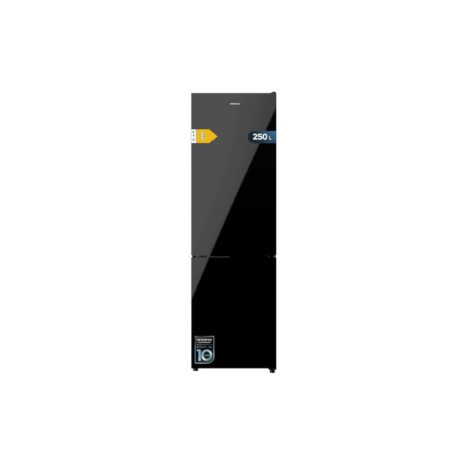 Kombi-Kühlschrank aus schwarzem Glas, 180 cm hoch und 55 cm breit, mit einem Fassungsvermögen von 250 Litern, Total No Frost, Energieklasse E, mit Multi Air Flow System, Fast Cooling Modus und Humidity Box mit Feuchtigkeitsregulierung sowie Türöffnungs- und Störungsalarm.