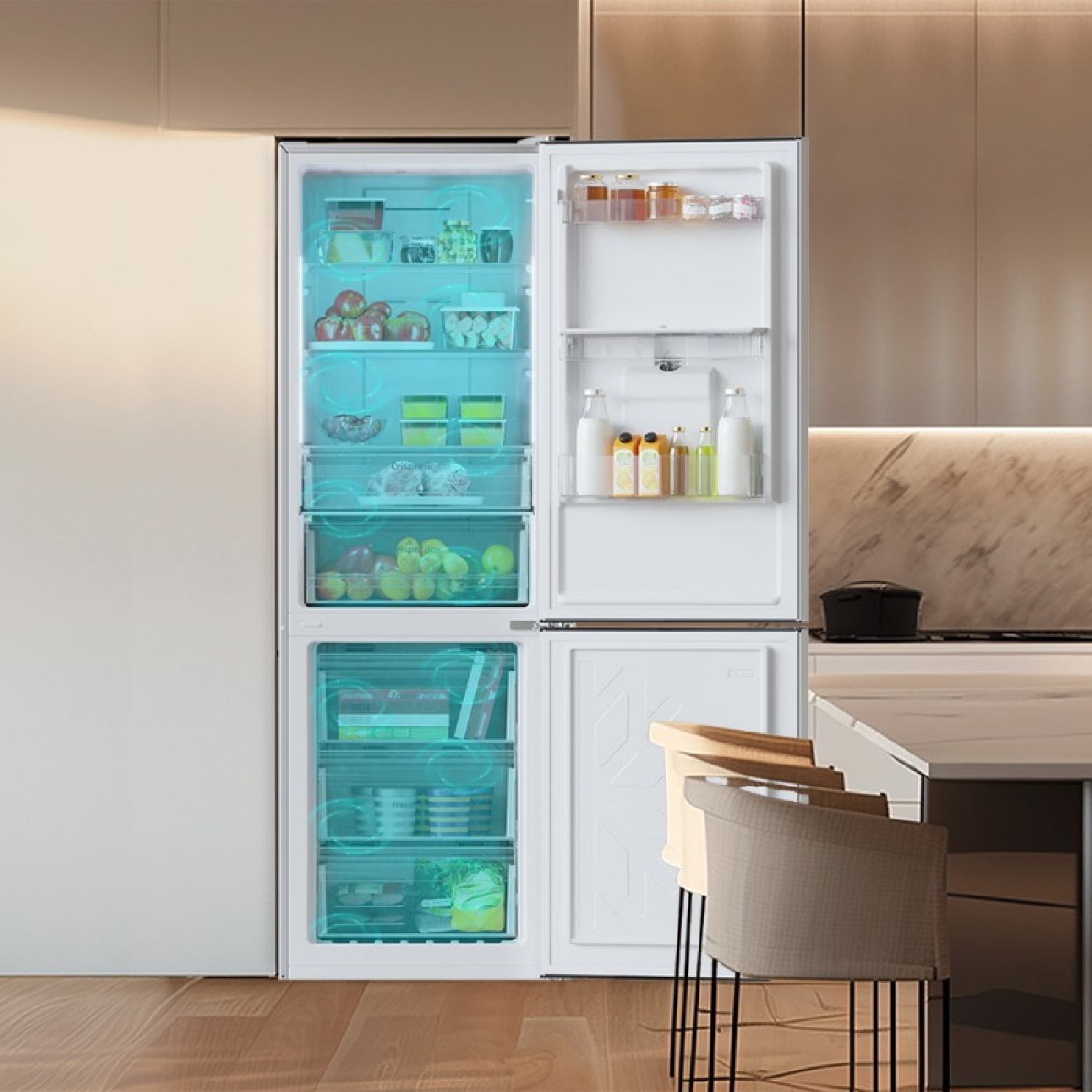 Kombikühlschrank aus Edelstahl, 185,5 cm hoch und 59,5 cm breit, mit 322 Litern Fassungsvermögen, Inverter Plus-Kompressor, Total No Frost, Wasserspender, Energieklasse E und mit Multi Air Flow-System. Außerdem verfügt er über den Modus Fast Cooling (Schnelles Kühlen).