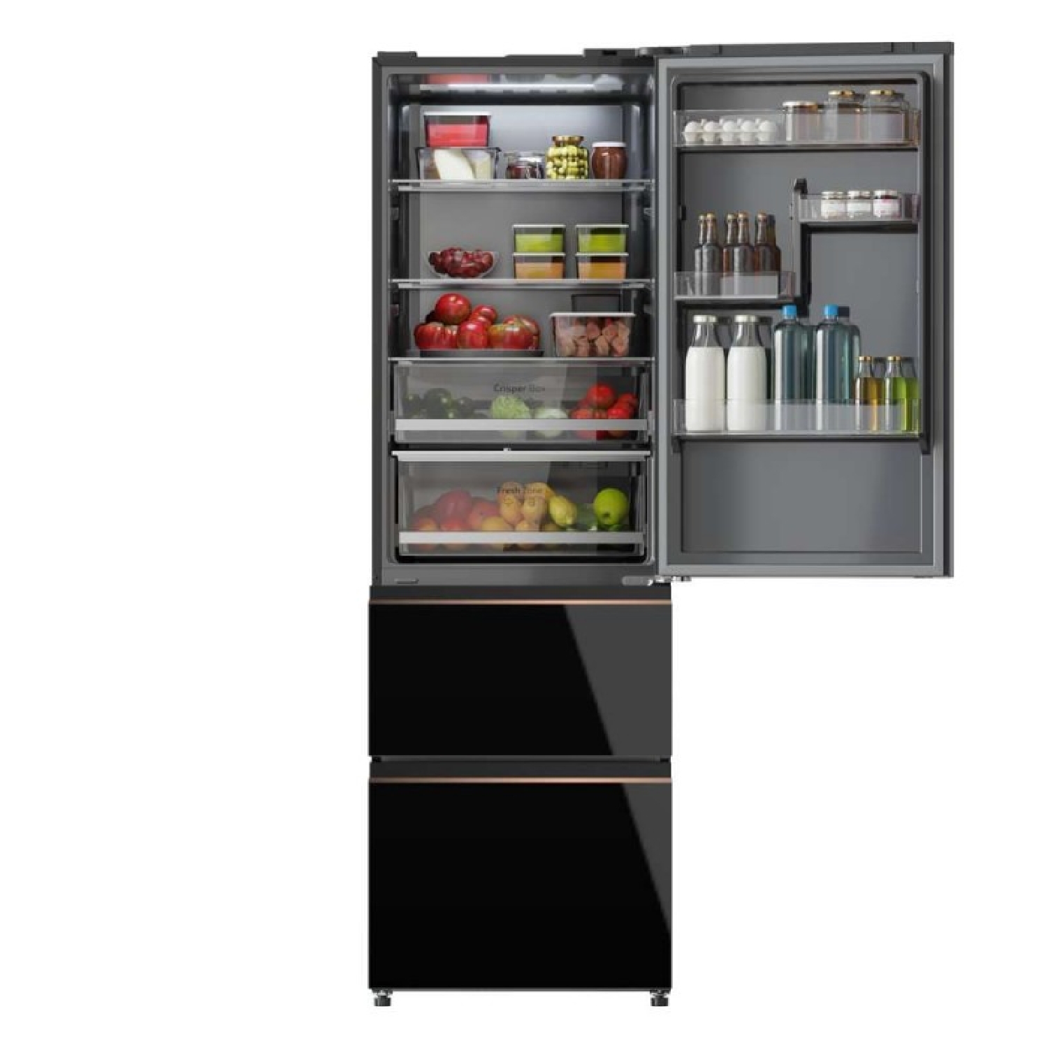 Kühlschrank Combi French Door Schwarzes Glas, Fassungsvermögen von 400 Litern, Breite von 60 cm und Höhe von 191 cm, Total NoFrost System, Max Inside, Multi AirFlow Kälteverteilung, Außen Digital Display, Innenraum mit Premium Design in Grau, Schubladen für Obst und Gemüse (eine davon umbaubar), Energieklasse E, Inverter Kompressor mit niedrigem Verbrauch und leise, Schnellkühlung, Schnellgefrierschrank, ECO Modus, Tür offen, Temperatur und Störungsalarm.