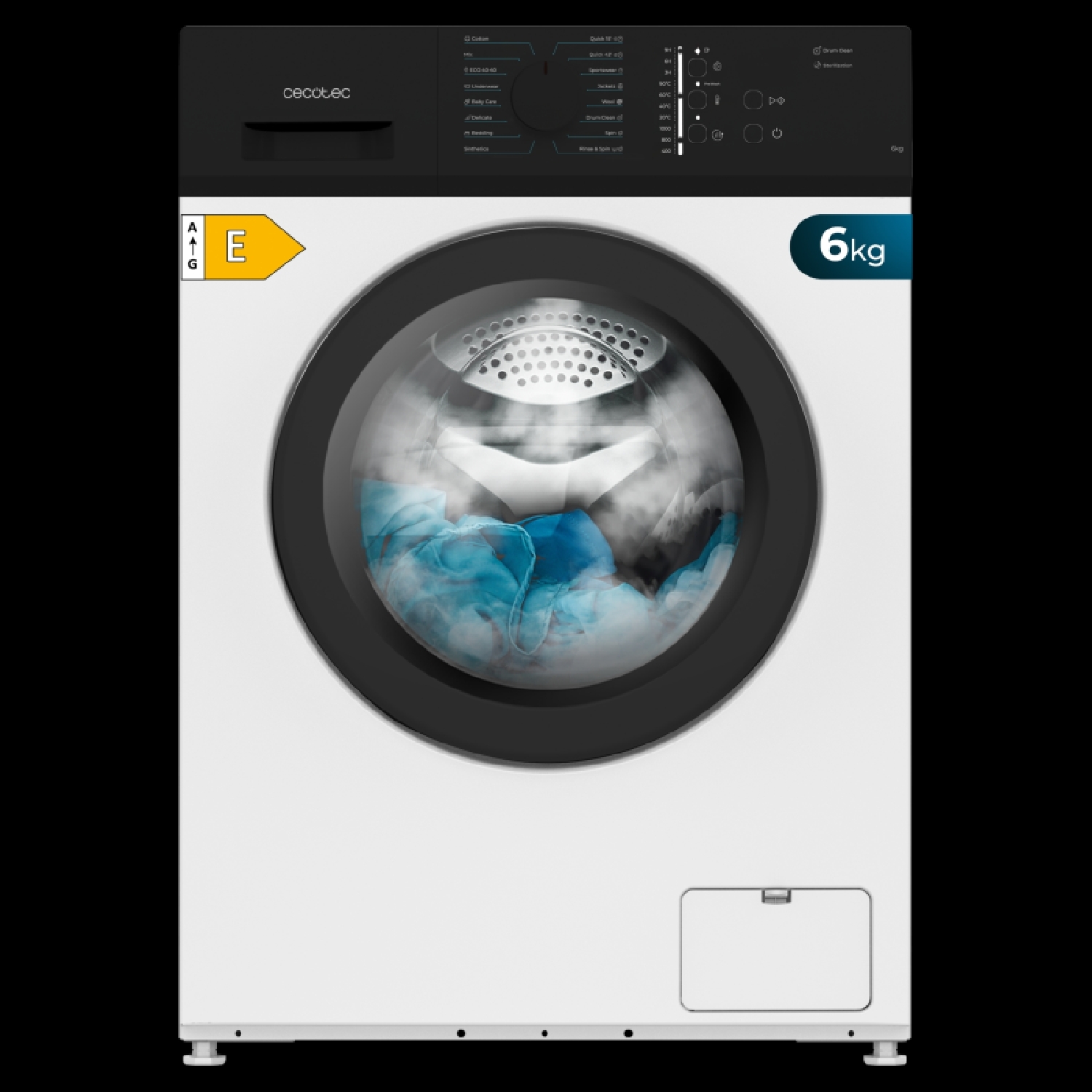 Waschmaschine mit 6 kg Fassungsvermögen, Klasse E, 1000 U/min, 16 Programme, Drum Clean (Trommelreinigung), Delay Start (Startverzögerung) und KidLock (Kindersicherung).