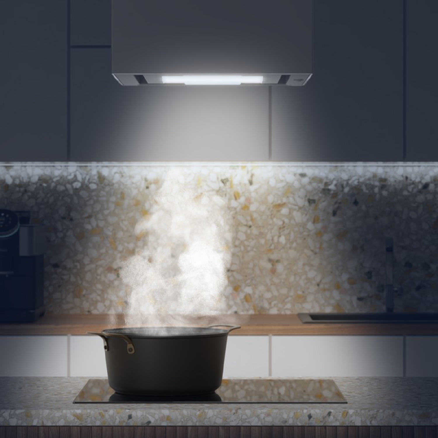 Quadratische hängende Dunstabzugshaube Bolero Flux CCT 448000 Glass White A++ 44 cm breit, weißes Glas, Absaugung 800 m3/h, 210 W Motor, Klasse A++, Touch Control, 3 Leistungsstufen, Booster, Licht, Kohlefilter, Hand Movement Control und Delay Function.