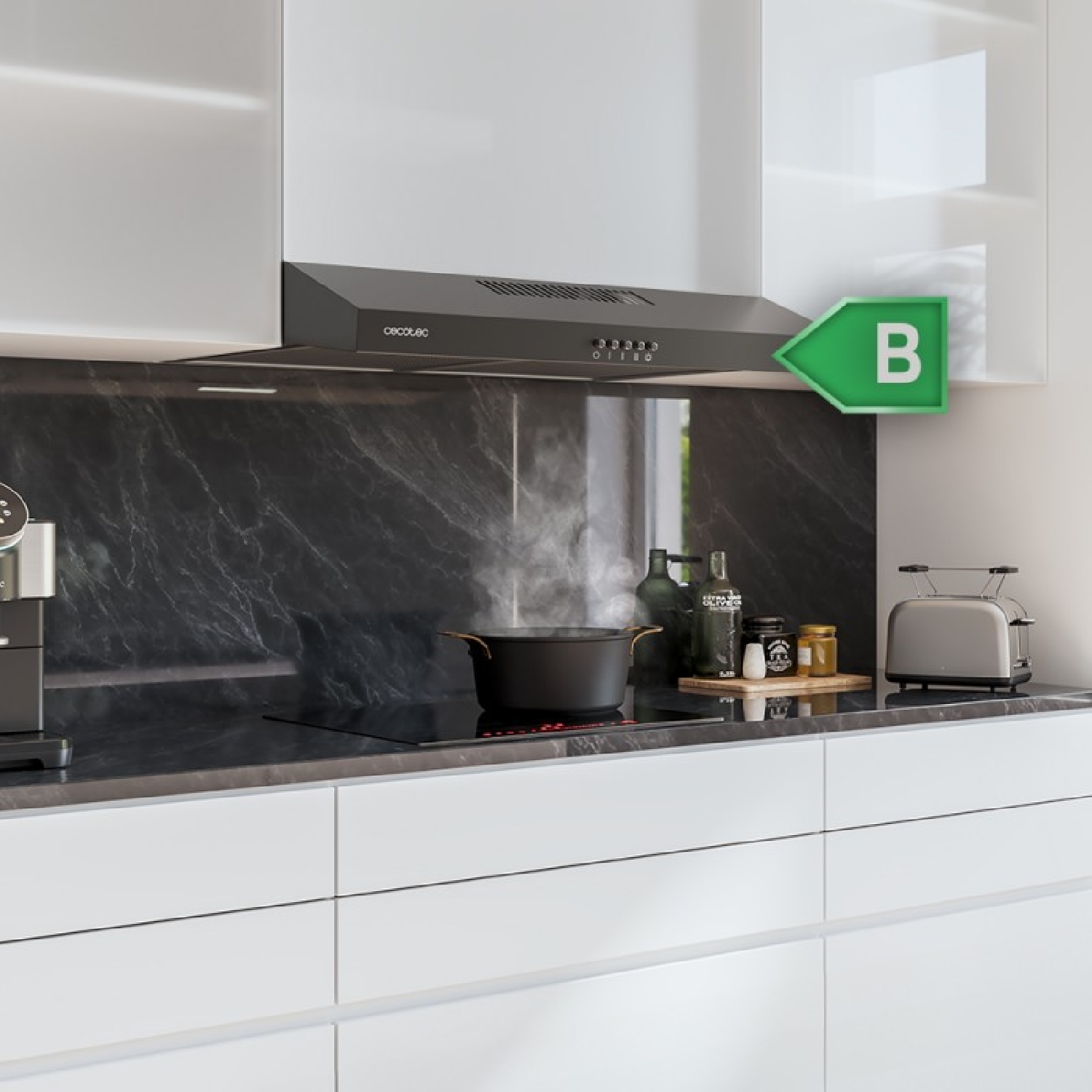 Flux CM 602200 Black B Konventionelle Dunstabzugshaube, 60 cm breit, schwarz lackiert, Saugleistung 220 m3/Std, Motor 70 W, Klasse B, mechanische Steuerung, 3 Leistungsstufen und Licht.