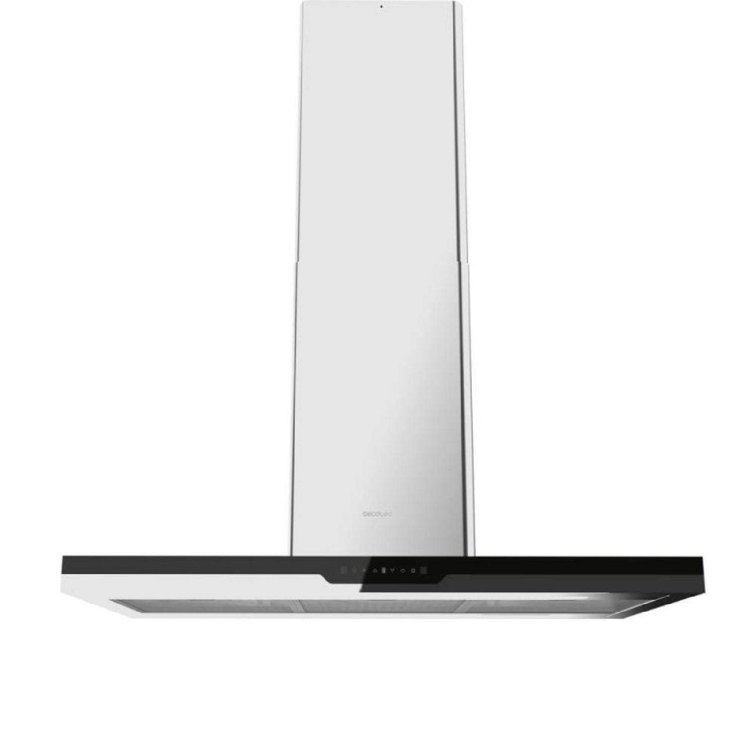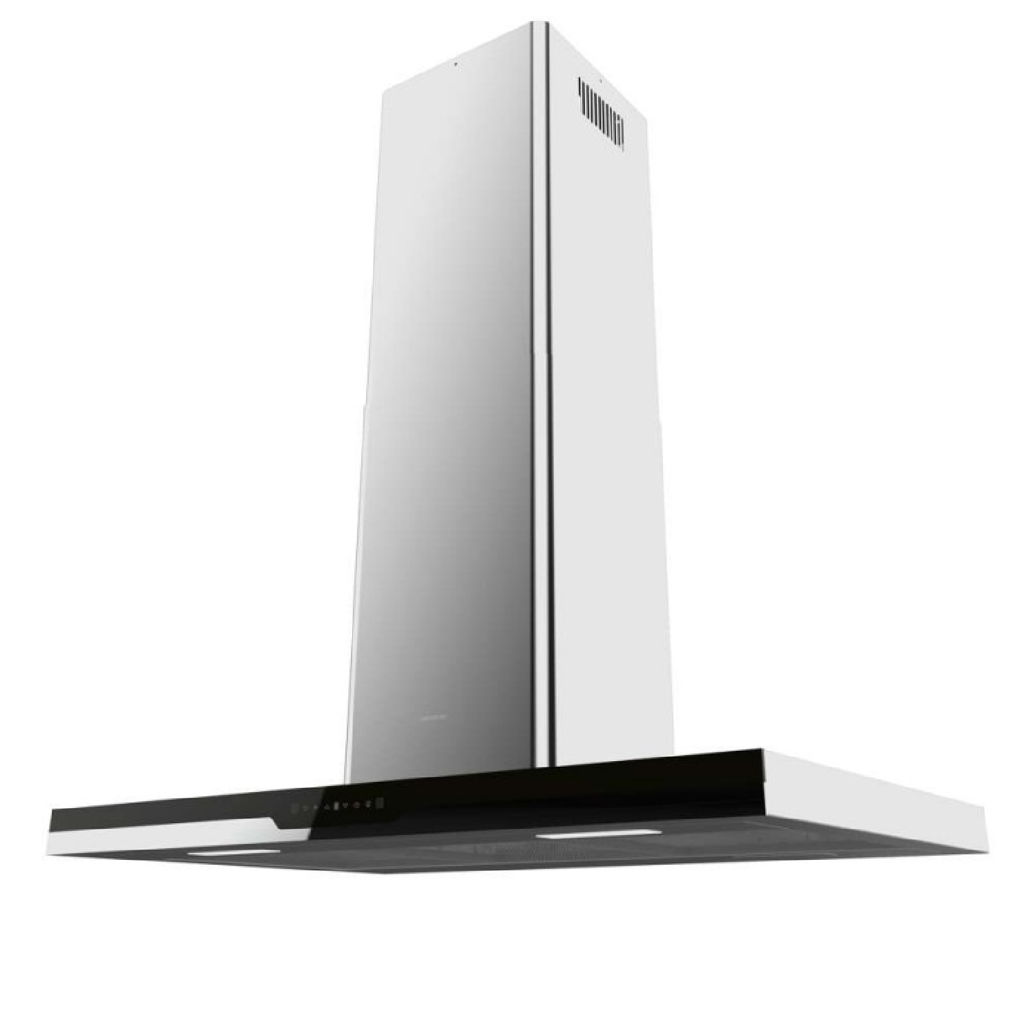 Insel-Dunstabzugshaube Bolero Flux ICT 908000 Glass Black A++, 90 cm breit, Front in schwarzem Glas mit Spiegeleffekt, Edelstahl-Schornstein, Saugleistung 800 m3/h, 210 W Motor, Klasse A++, Touch-Steuerung, 3 Leistungsstufen, Licht, Kohlefilter, Hand Movement Control und Delay Function.
