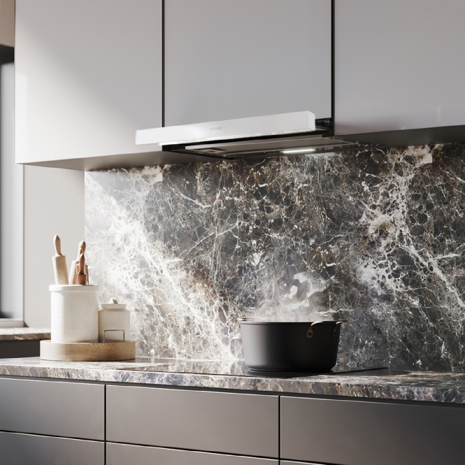 Flux TLM 603500 White A Teleskop-Dunstabzugshaube, 60 cm breit, weiße Ausführung, Saugleistung 350 m3/h, Motor 70 W, Klasse A, mechanische Steuerung, 2 Leistungsstufen und Kohlefilter.