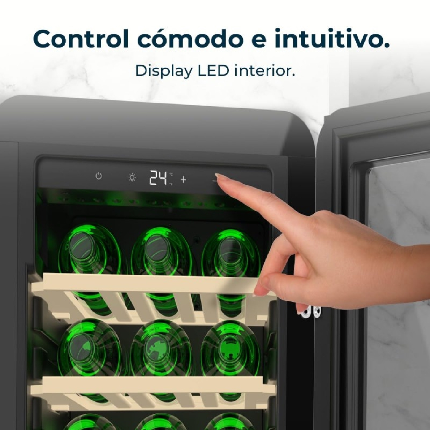 Weinkühlschrank im Retro-Design, Farbe schwarz, Fassungsvermögen 18 Flaschen, Elektronische Temperaturkontrolle durch LED-display, Einstellbarer Temperaturbereich von 5 bis 20ºC, Integrierter Kompressor, NoFrost-Technologie, Holzablagen, Innenbeleuchtung, Innenbelüftung mit Ventilator, Maße Höhe 74,3cm, Breite 36,6cm, Tiefe 47,6cm