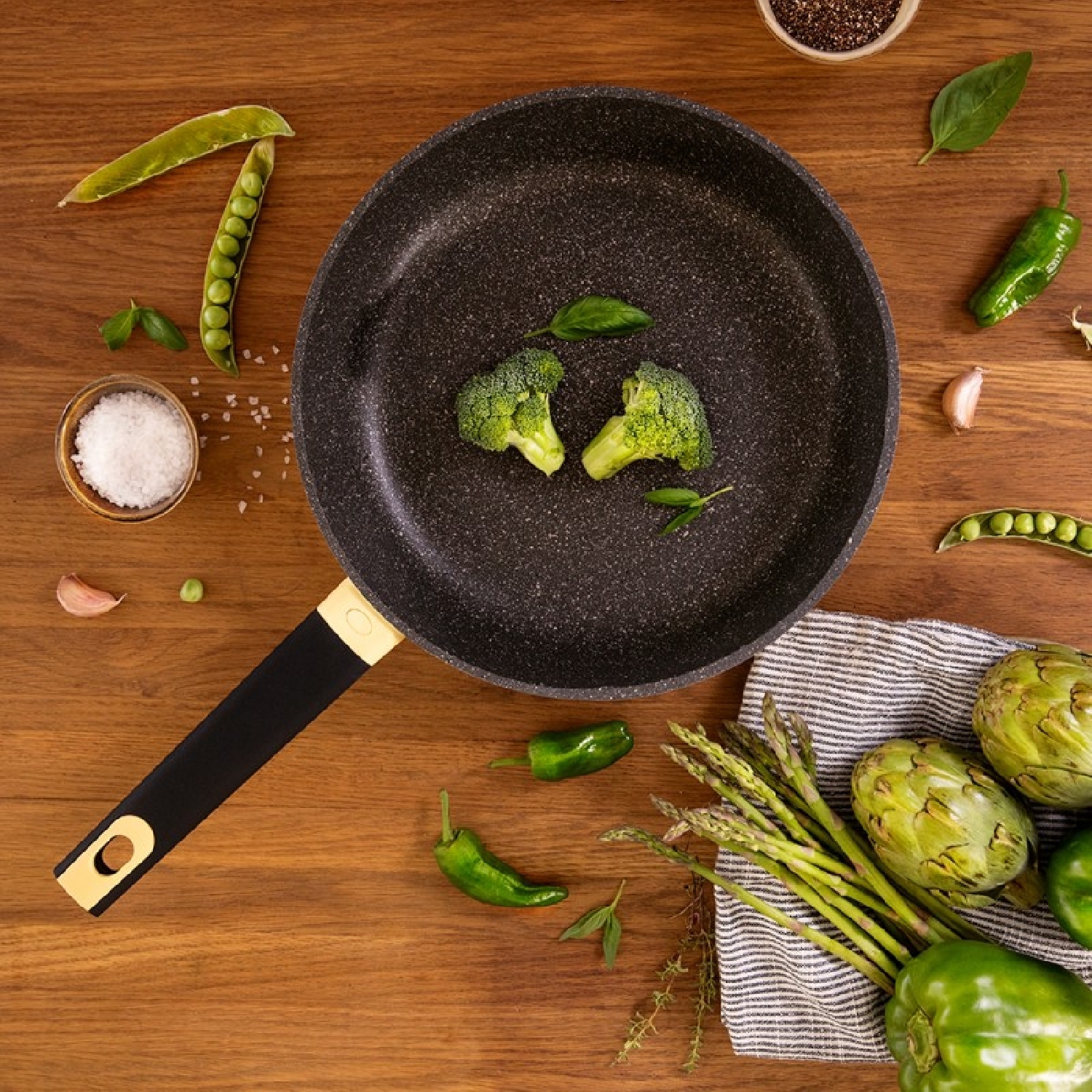 Bratpfannenset 18-22-26 cm aus hochwertigem Aluminiumguss mit 5 Schichten und PFOA-freier Select Teflon® Antihaftbeschichtung, Vollinduktions-Wärmediffusorboden, spülmaschinenfest und für alle Herdarten einschließlich Induktion geeignet.