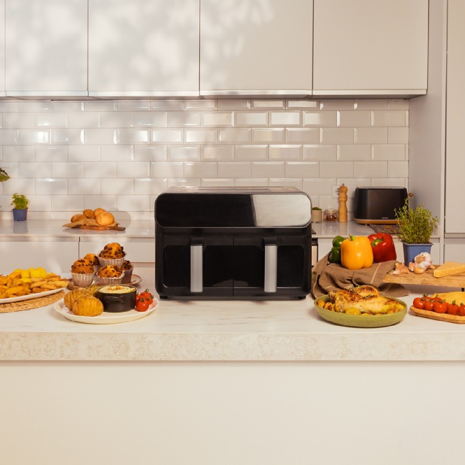 Digitale Fritteuse mit 9 L Fassungsvermögen und 2800 W Leistung, zwei Körbe mit doppelter Temperatur.