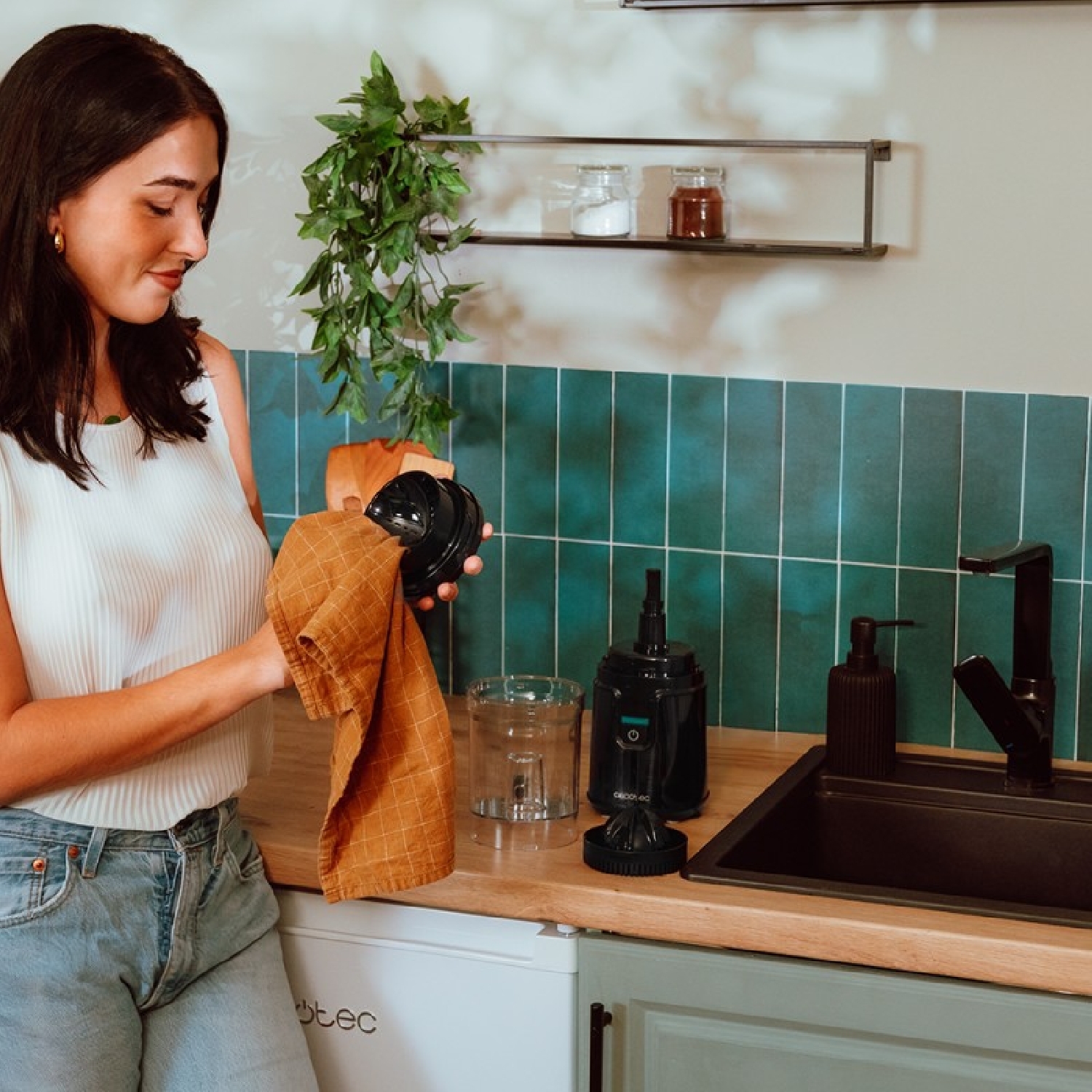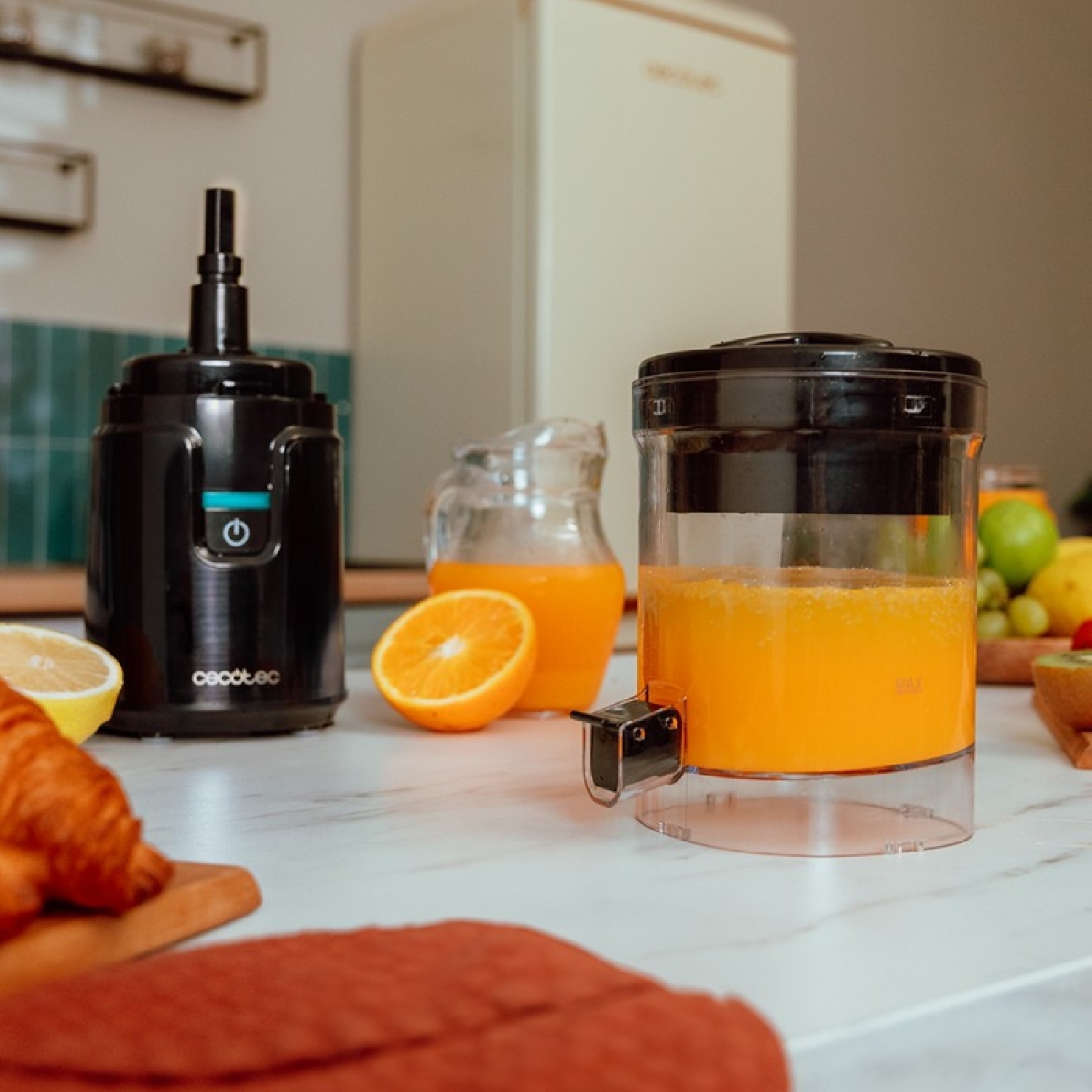 Elektrischer Turm-Entsafter mit einer Leistung von 140 W und einem Fassungsvermögen von 0,35 l. Enthält einen Filter und einen Kunststoffkegel. Eine einzige Drehrichtung.
