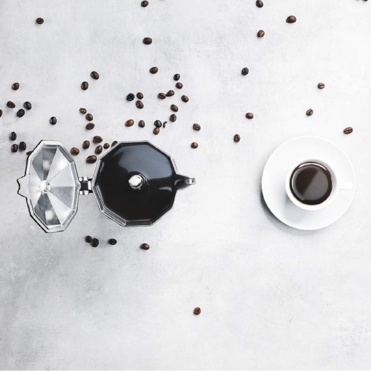 Schwarzer Espressokocher aus Aluminium für 6 Tassen, geeignet für verschiedene Arten Herde und einfach zu reinigen.
