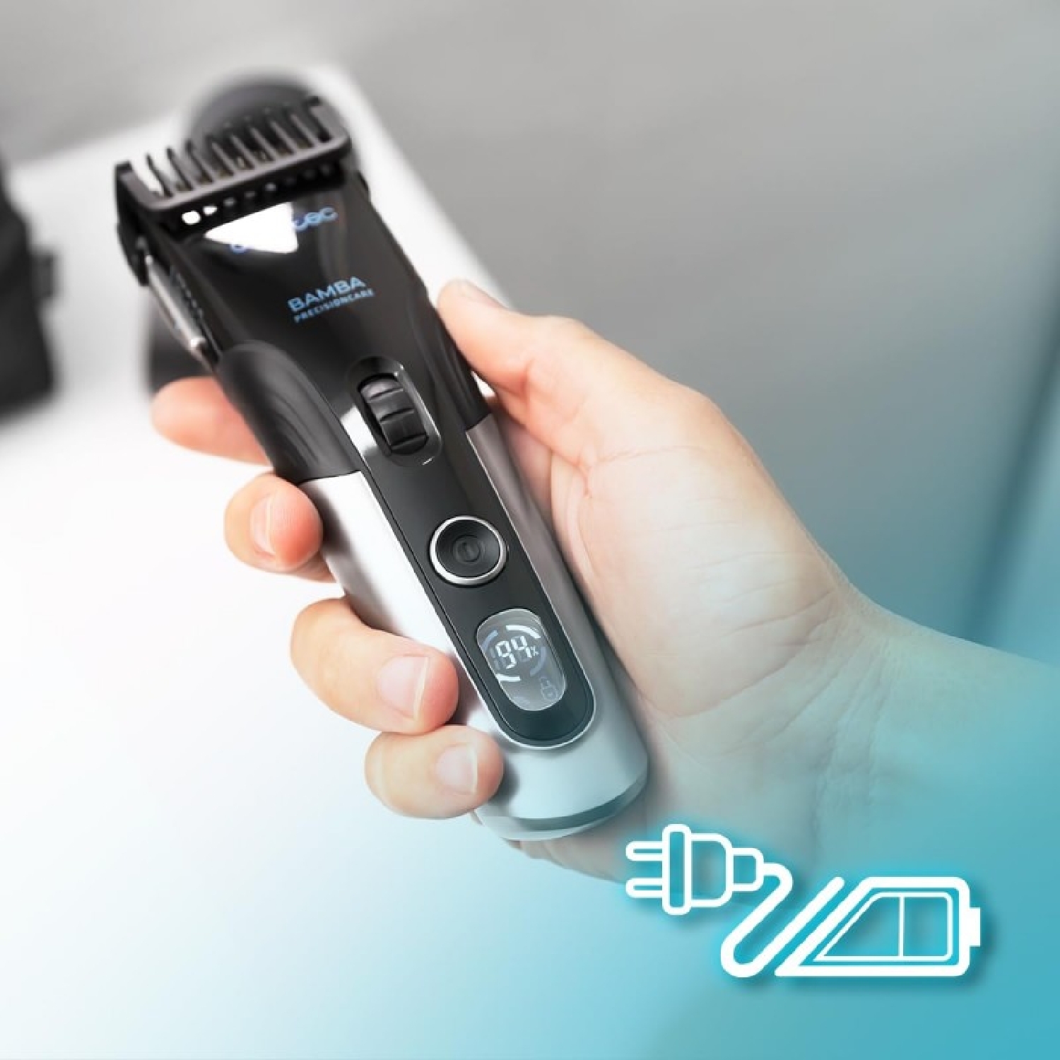 Haarschneider mit Batterie, Display und Klingen aus Titan beschichtet.
