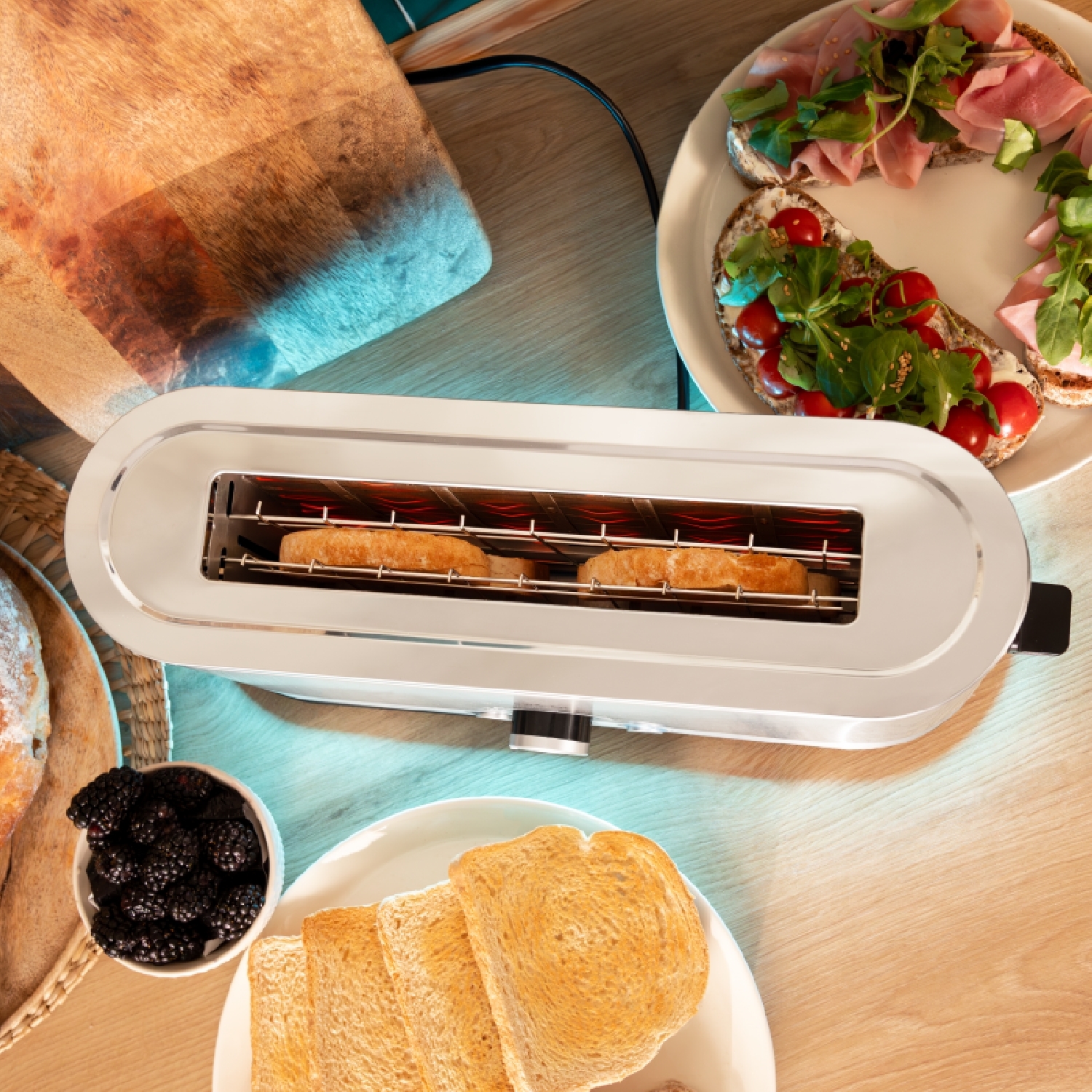 Vertikaler Stahltoaster mit langem Schlitz und beleuchtetem Ring mit Fassunsvermögen für 2 Scheiben Toast.