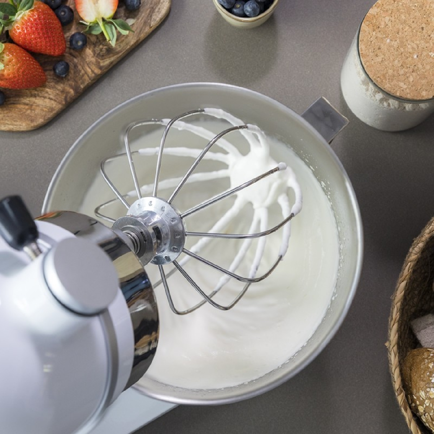 Mixer aus Aluminiumguss mit 800 W Gleichstrommotor, Digitalwähler mit 8 Geschwindigkeiten und 5,2 L Edelstahlschüssel. Enthält einen Schneebesen, einen Mixer und einen Knetarm.