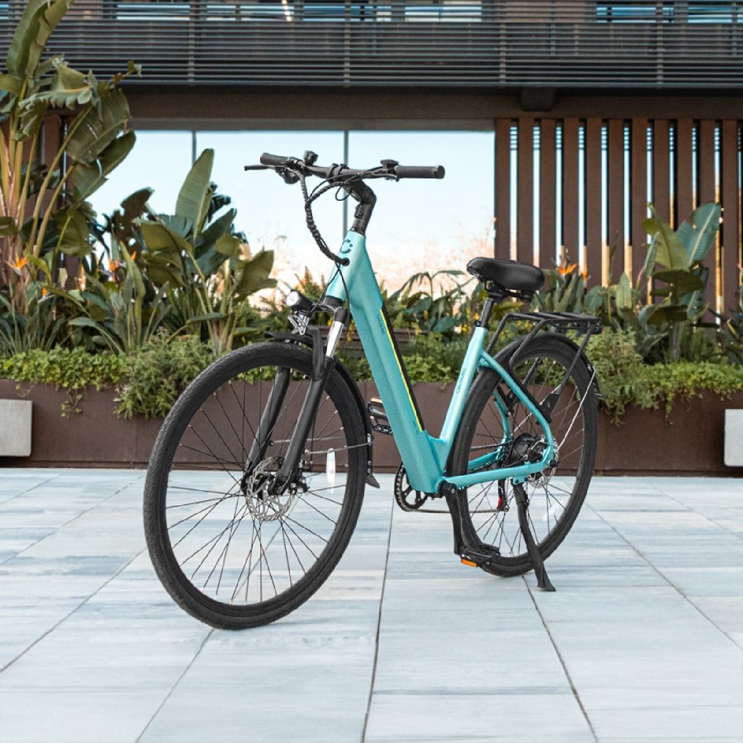 Elektrisches City-Bike (28 Zoll) mit 90 km* Reichweite, Vorderradfederung, Shimano-7-Gang-Schaltung und Doppelscheibenbremse.