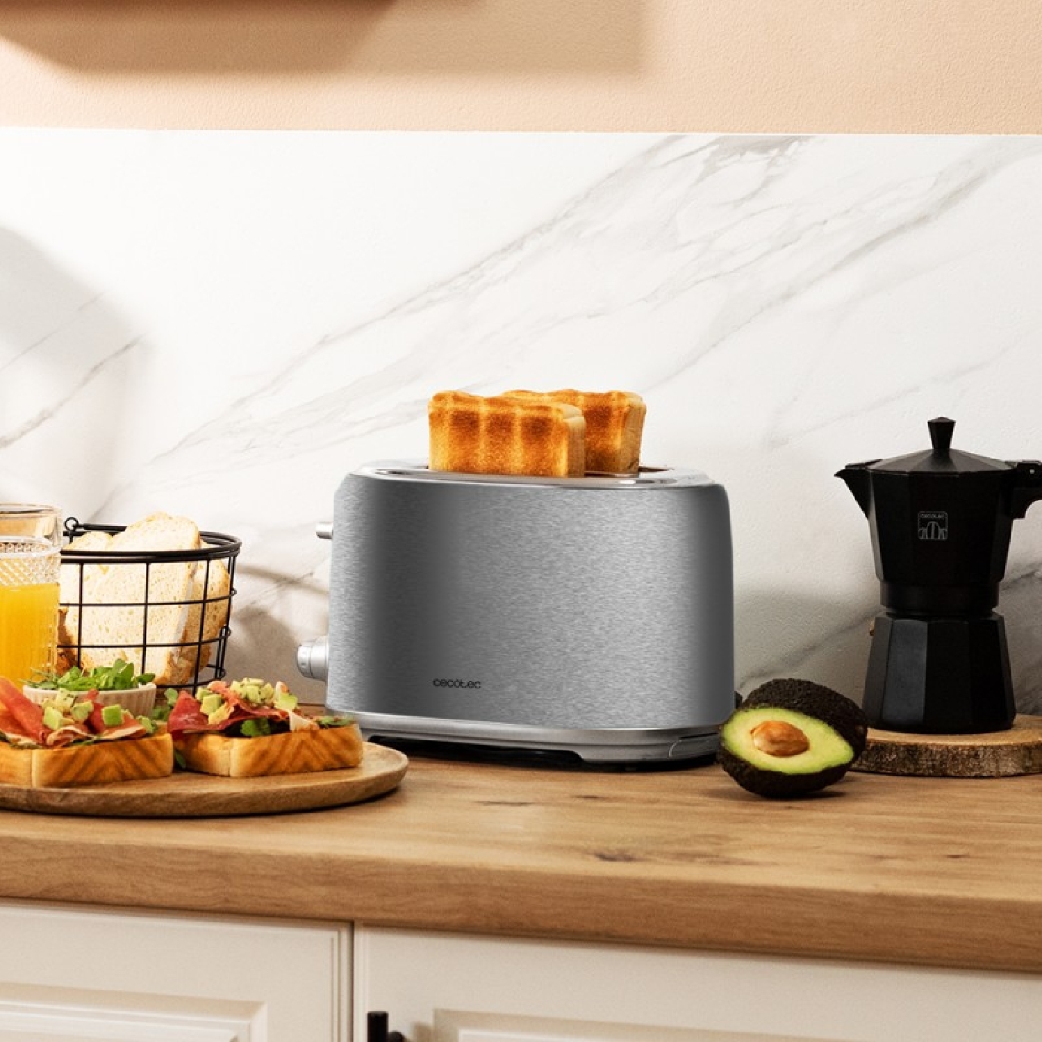 Stahltoaster mit 2 langen und kurzen Schlitzen für 2 Toasts.